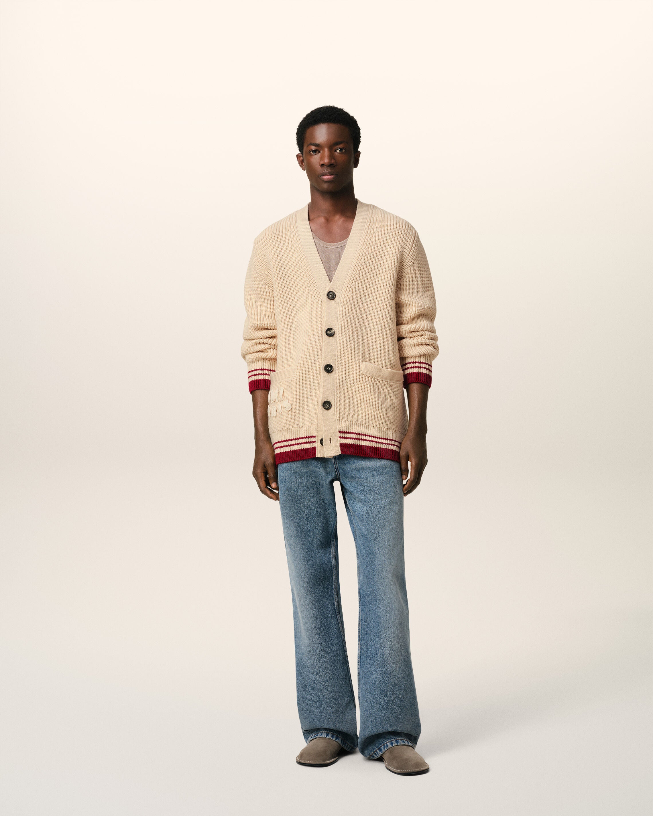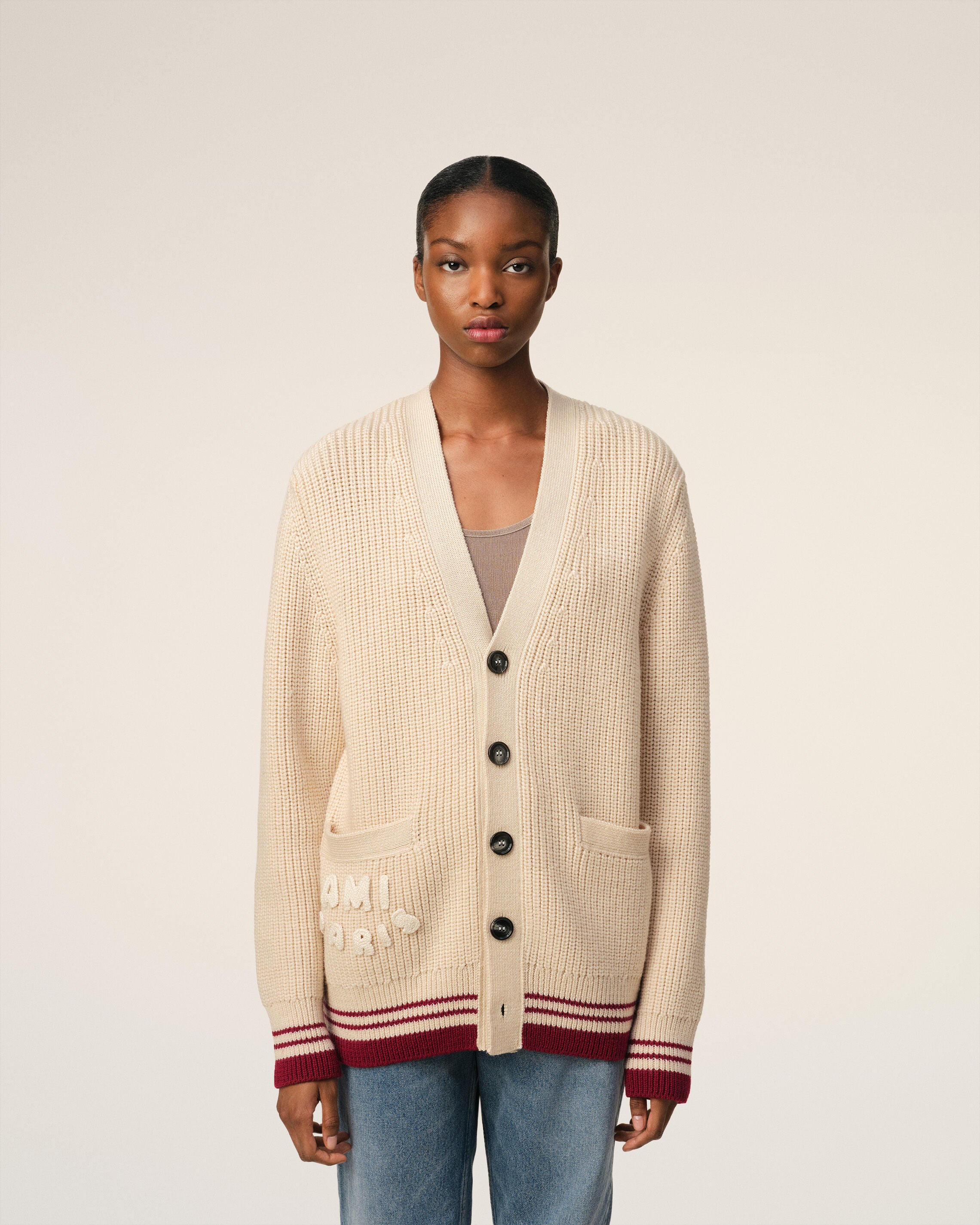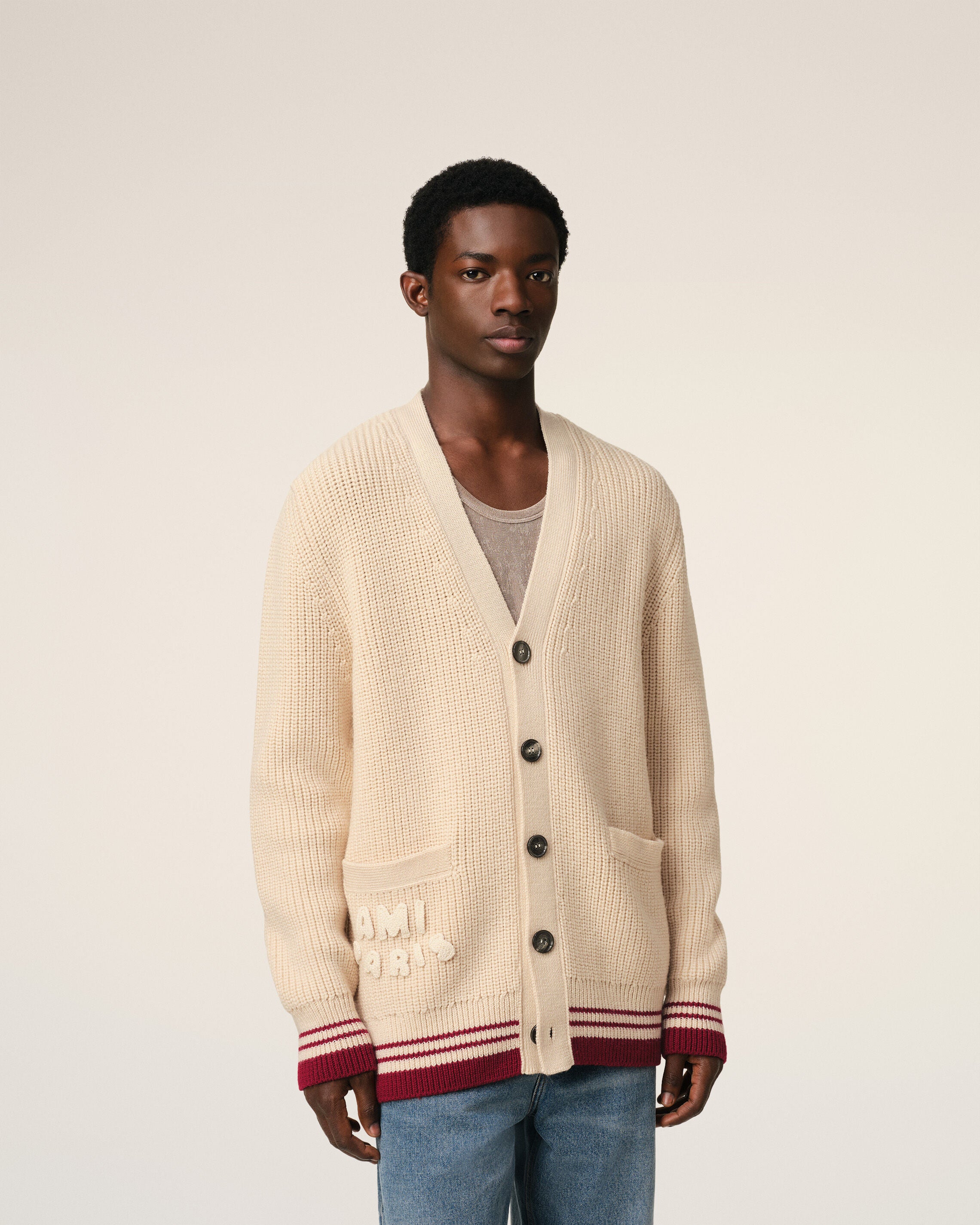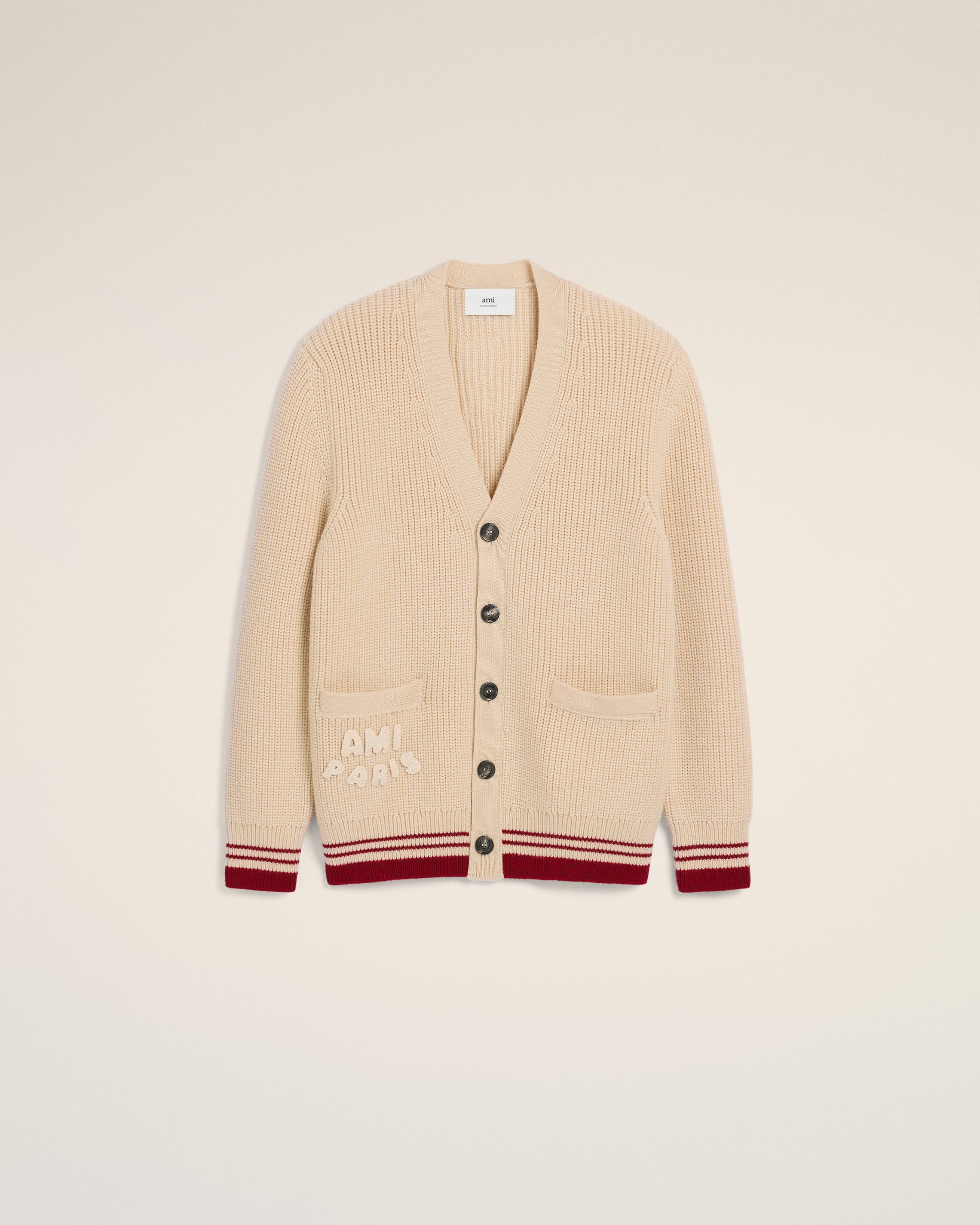 Gestrickter „AMI Paris“ Aufnäher unter der rechten Tasche gestickt