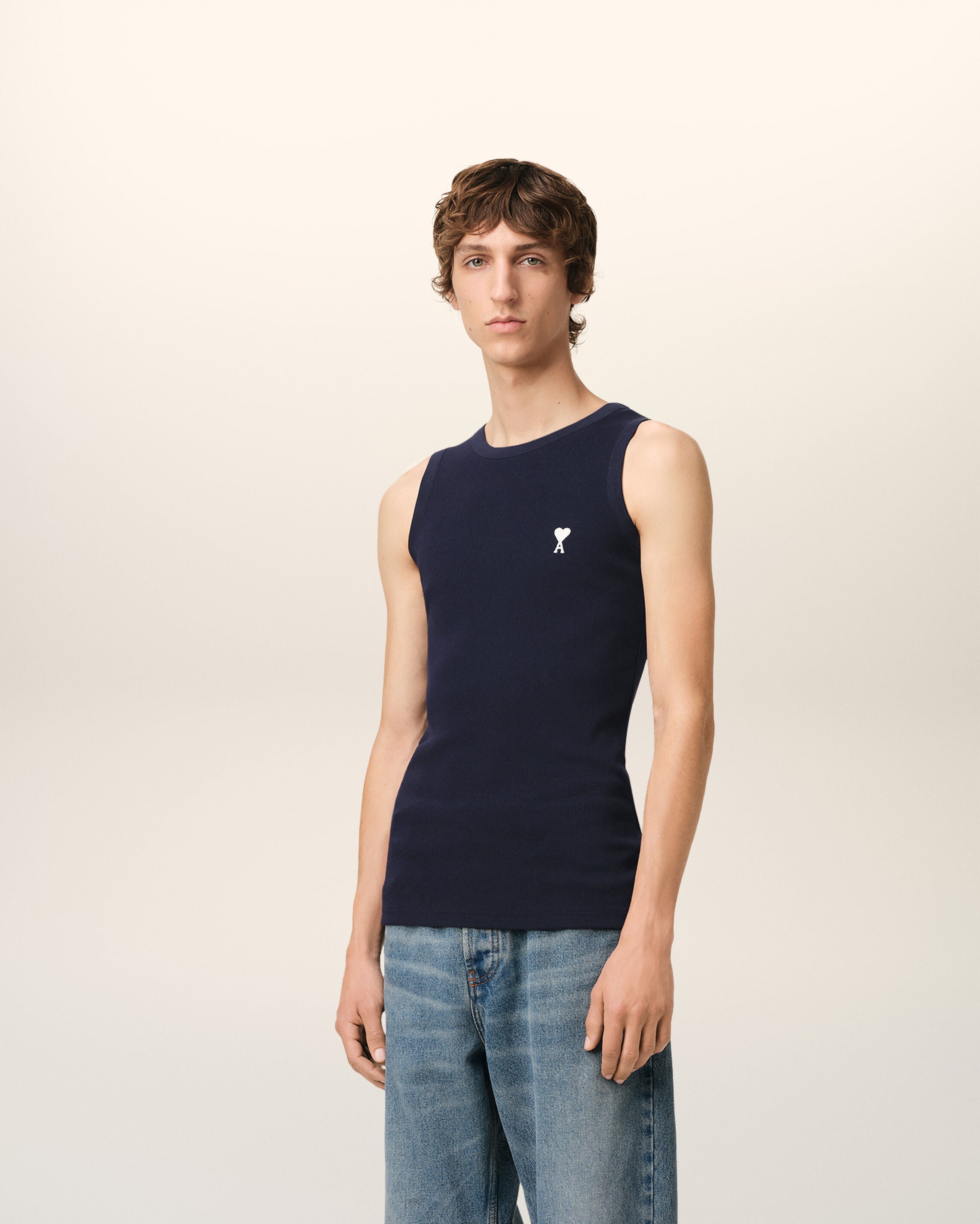 Tonal "AMI" embroidery under back neckline