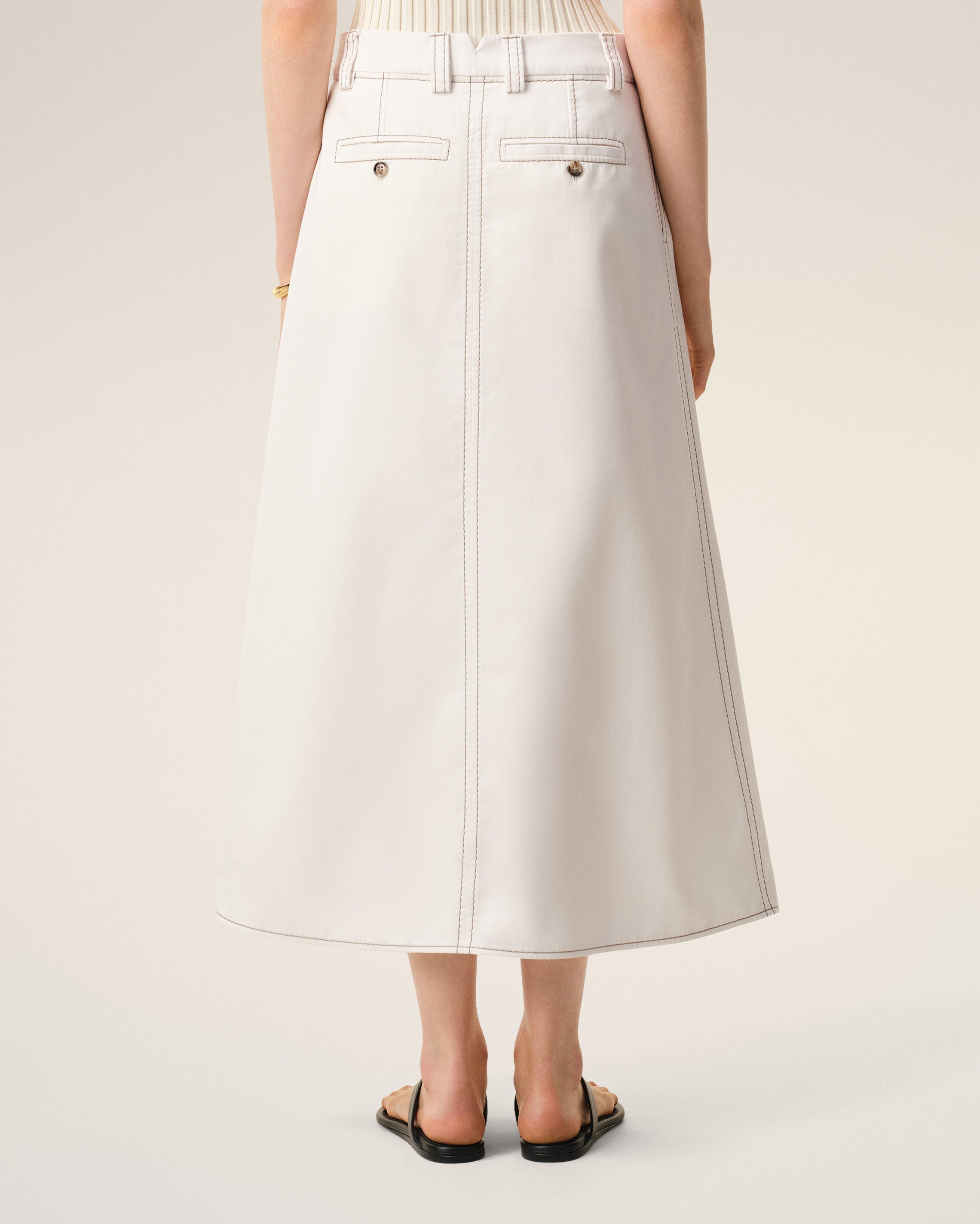 Long trapeze skirt in light cotton gabardine with bold contrasted topstitches.