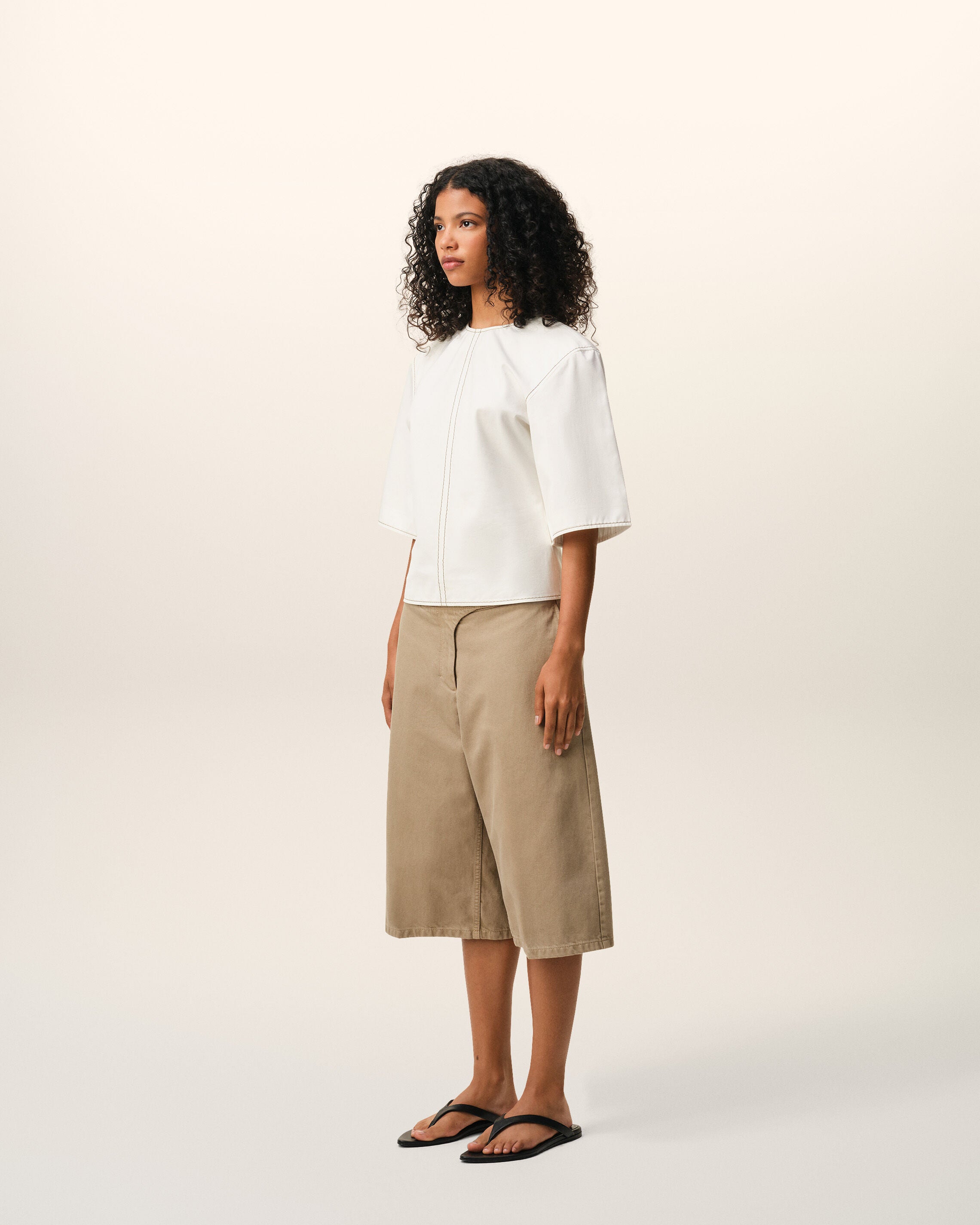 Top with short sleeves in light cotton gabardine with bold contrasted topstitches.