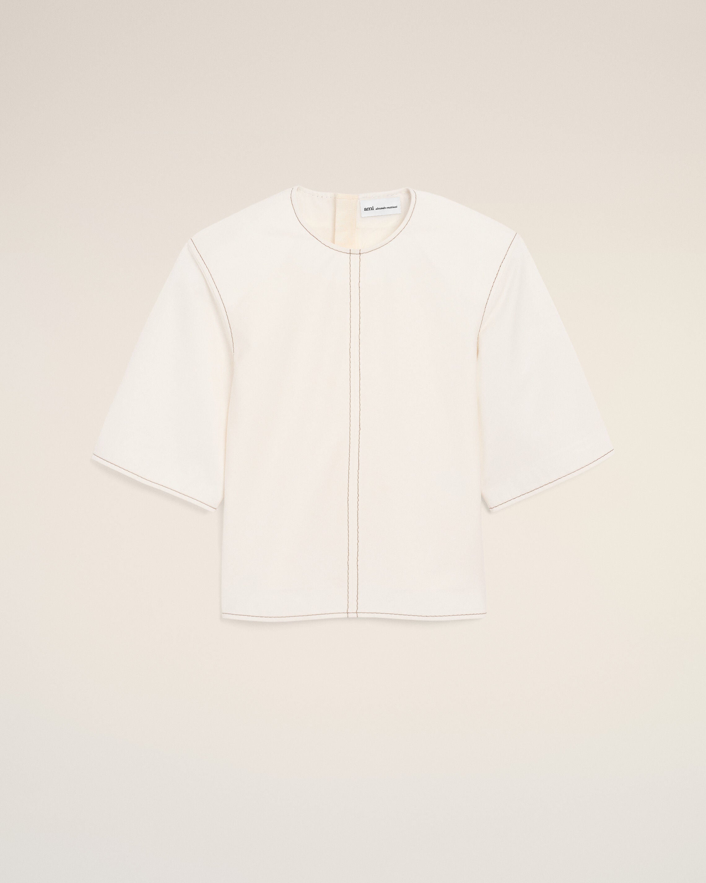 Top with short sleeves in light cotton gabardine with bold contrasted topstitches.