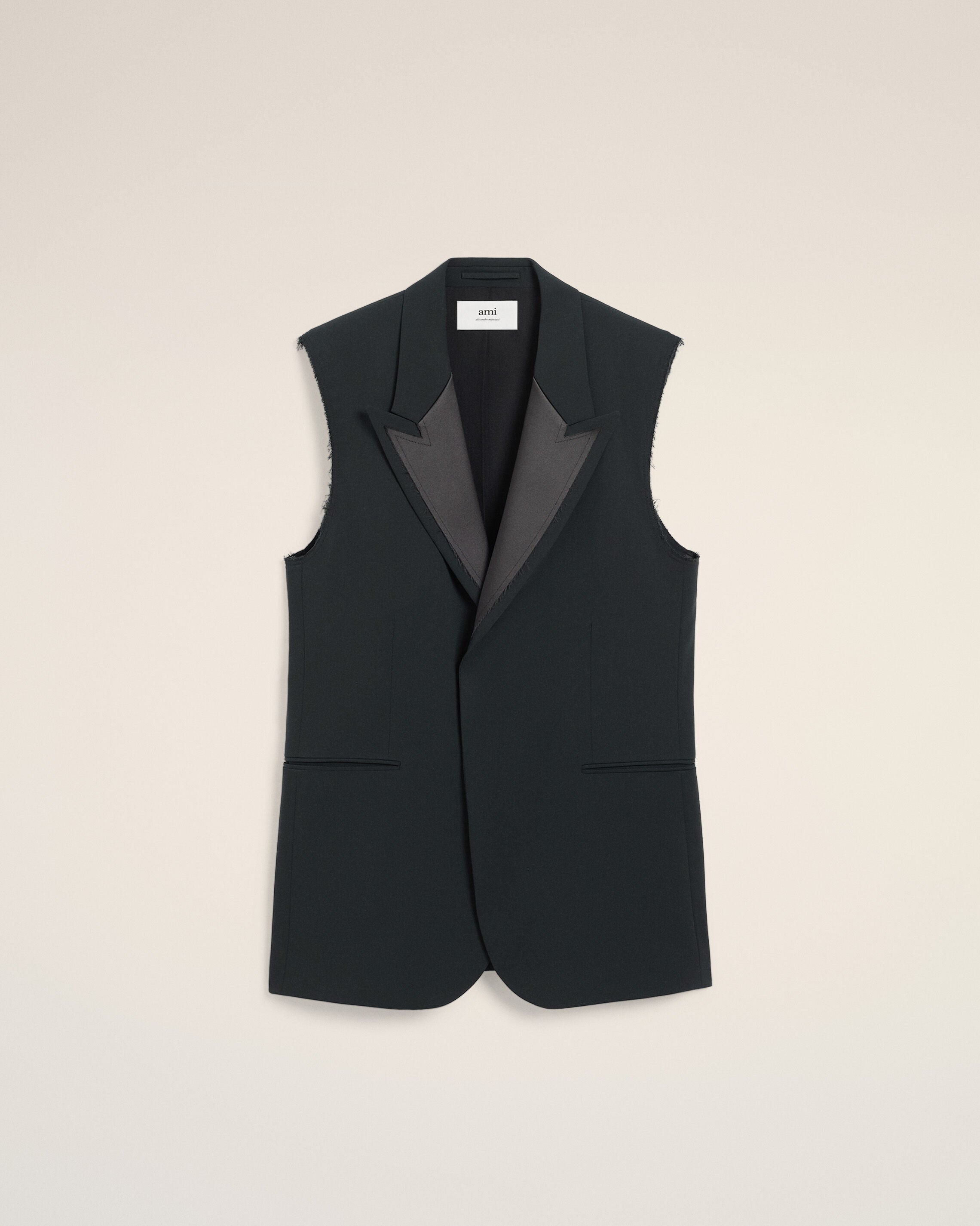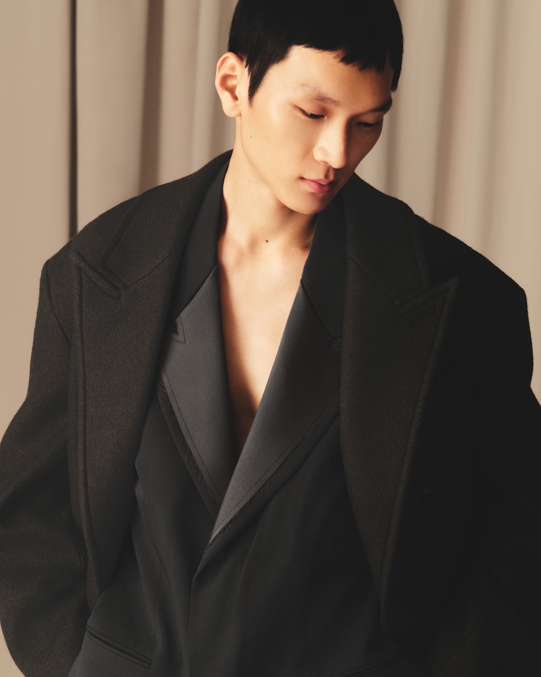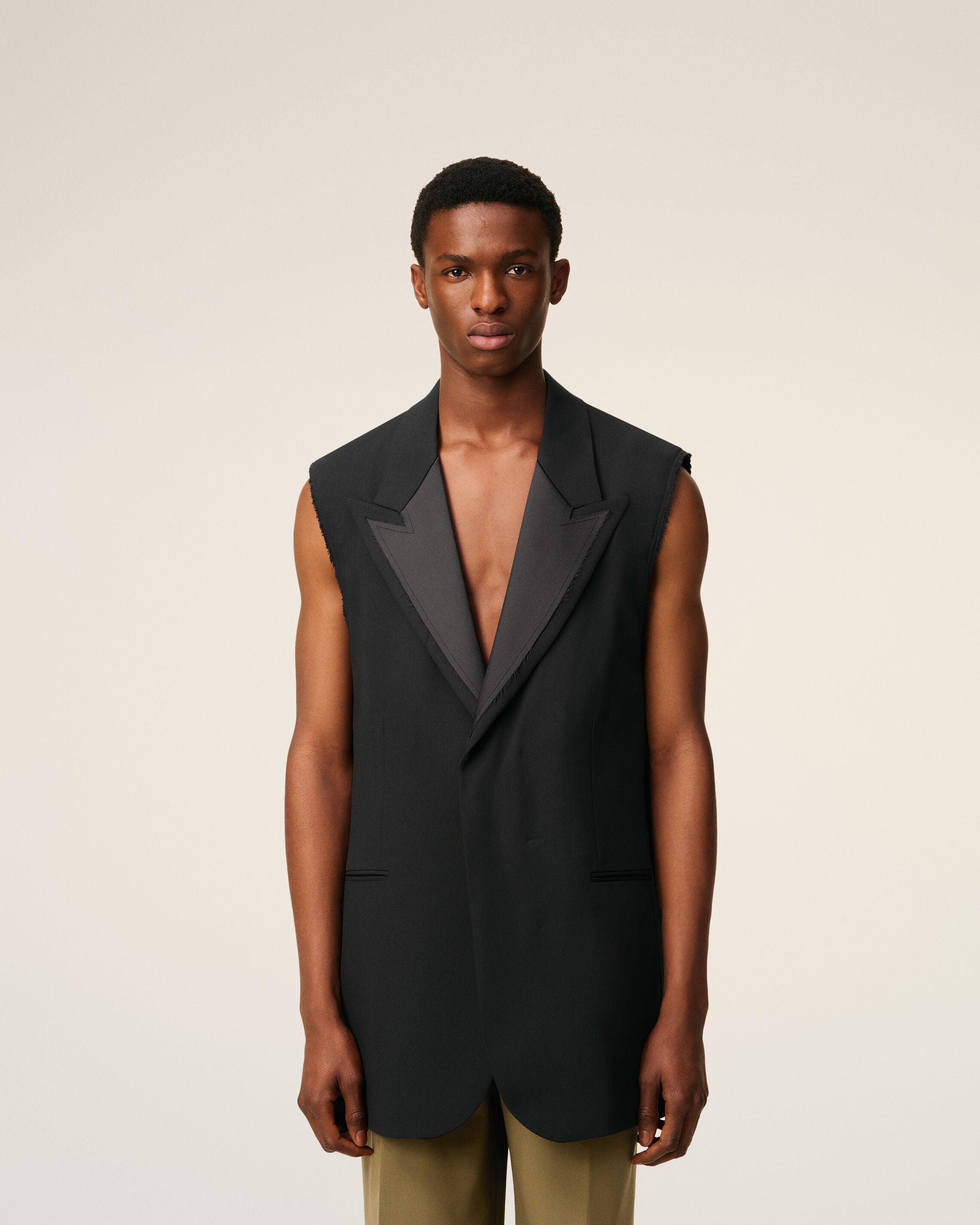 Collar lapel with raw edge cut, featuring the application of a second layer in satin also cut with raw edges