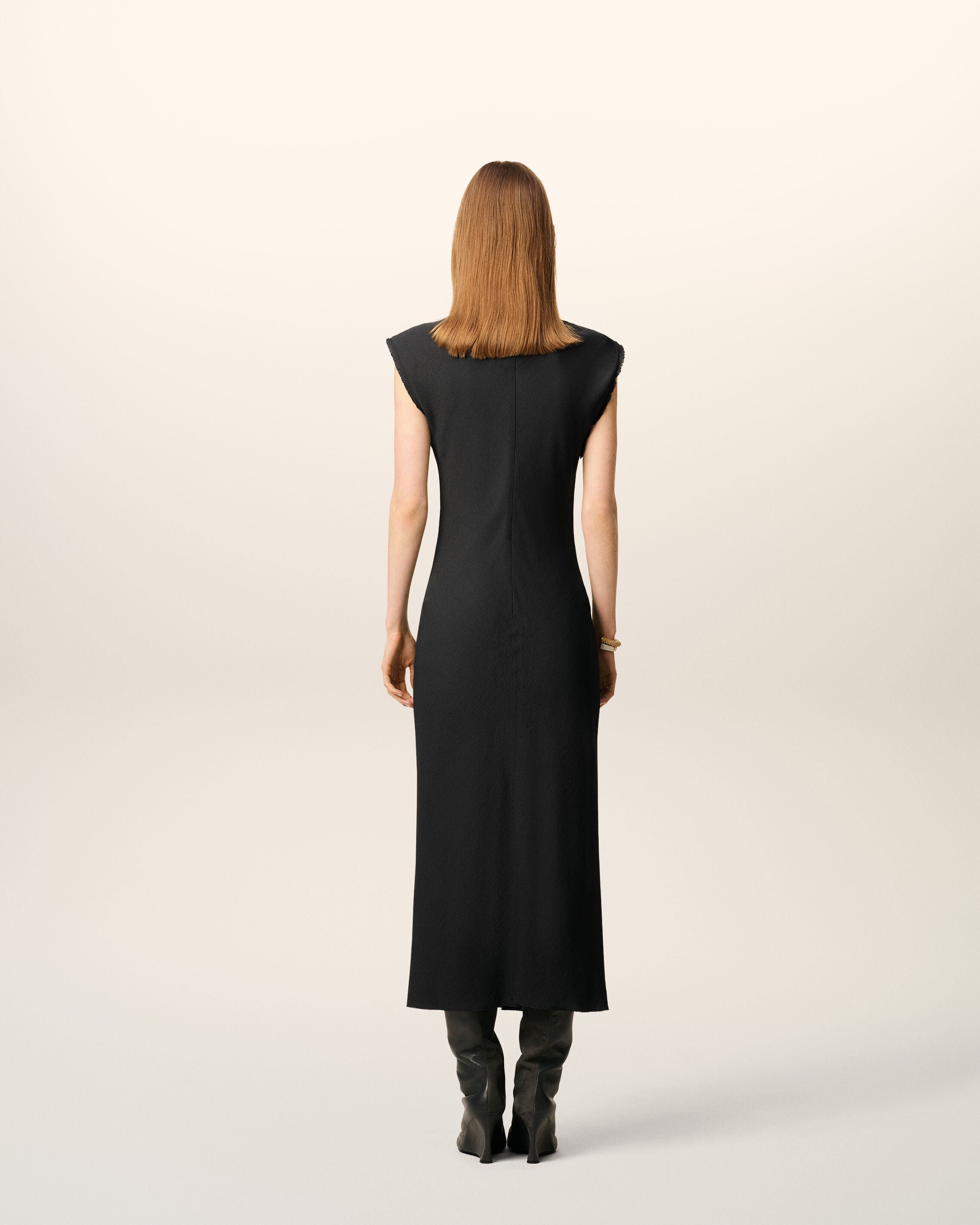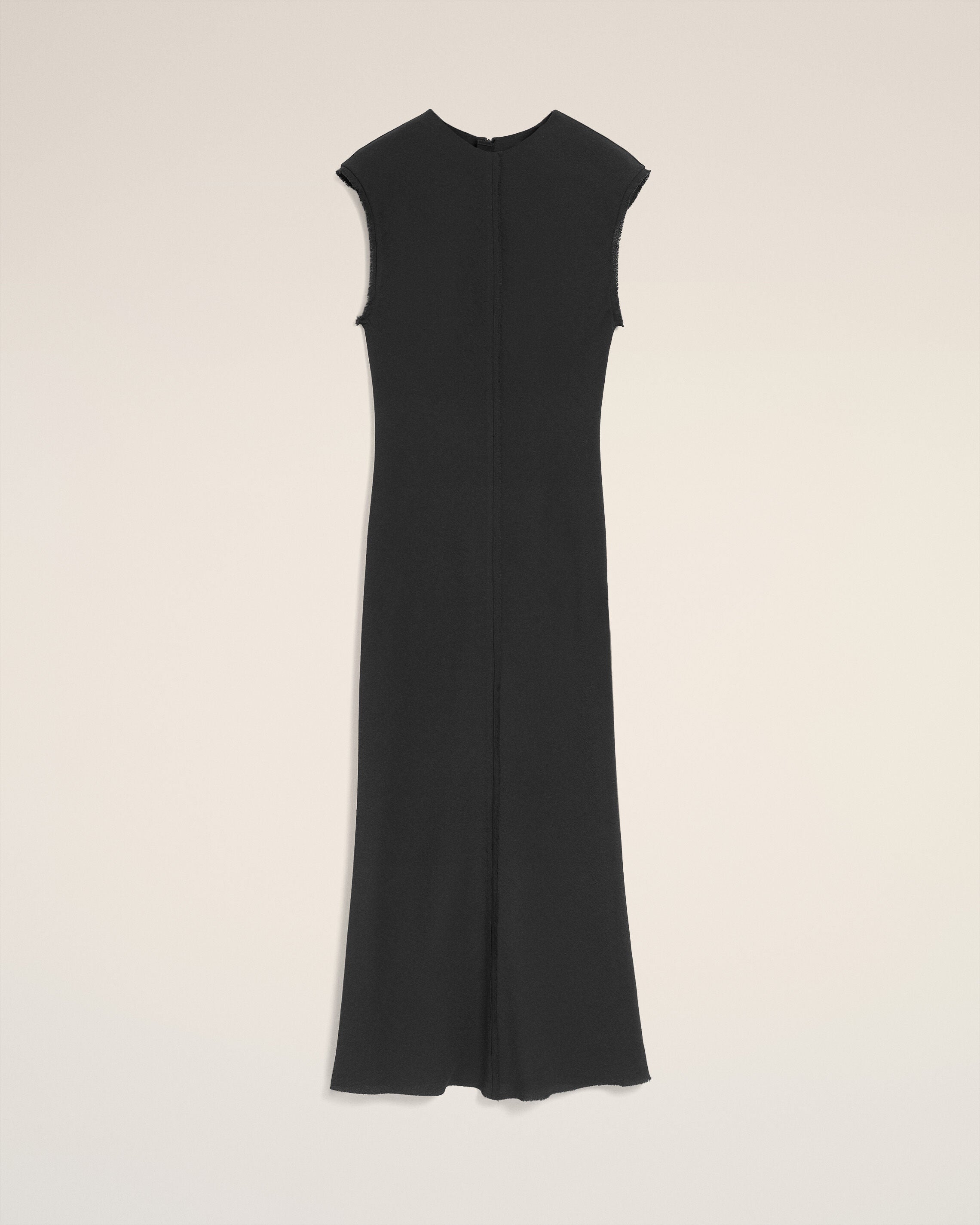 Long dress with raw edge details in viscose crepe.