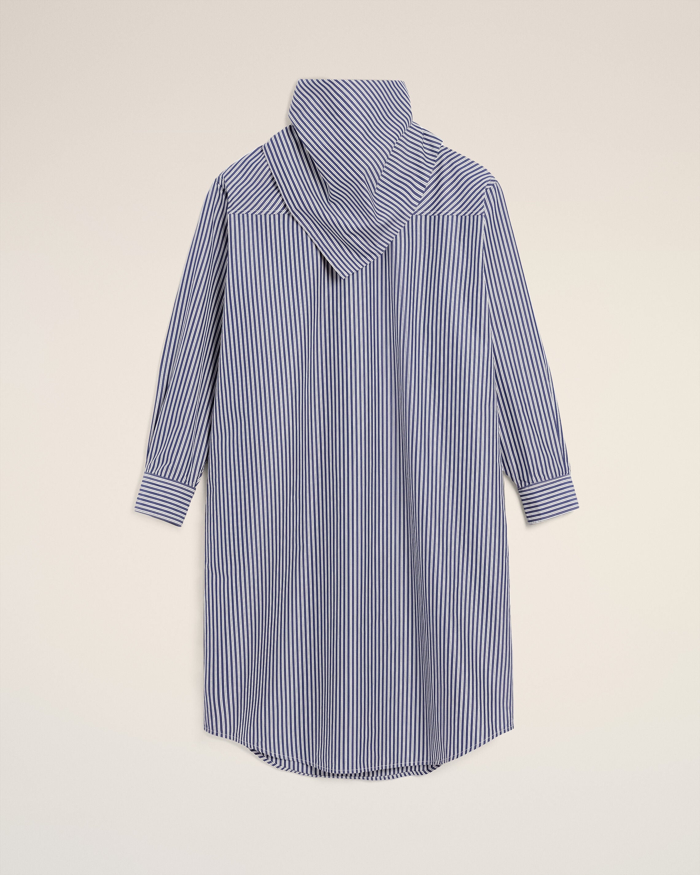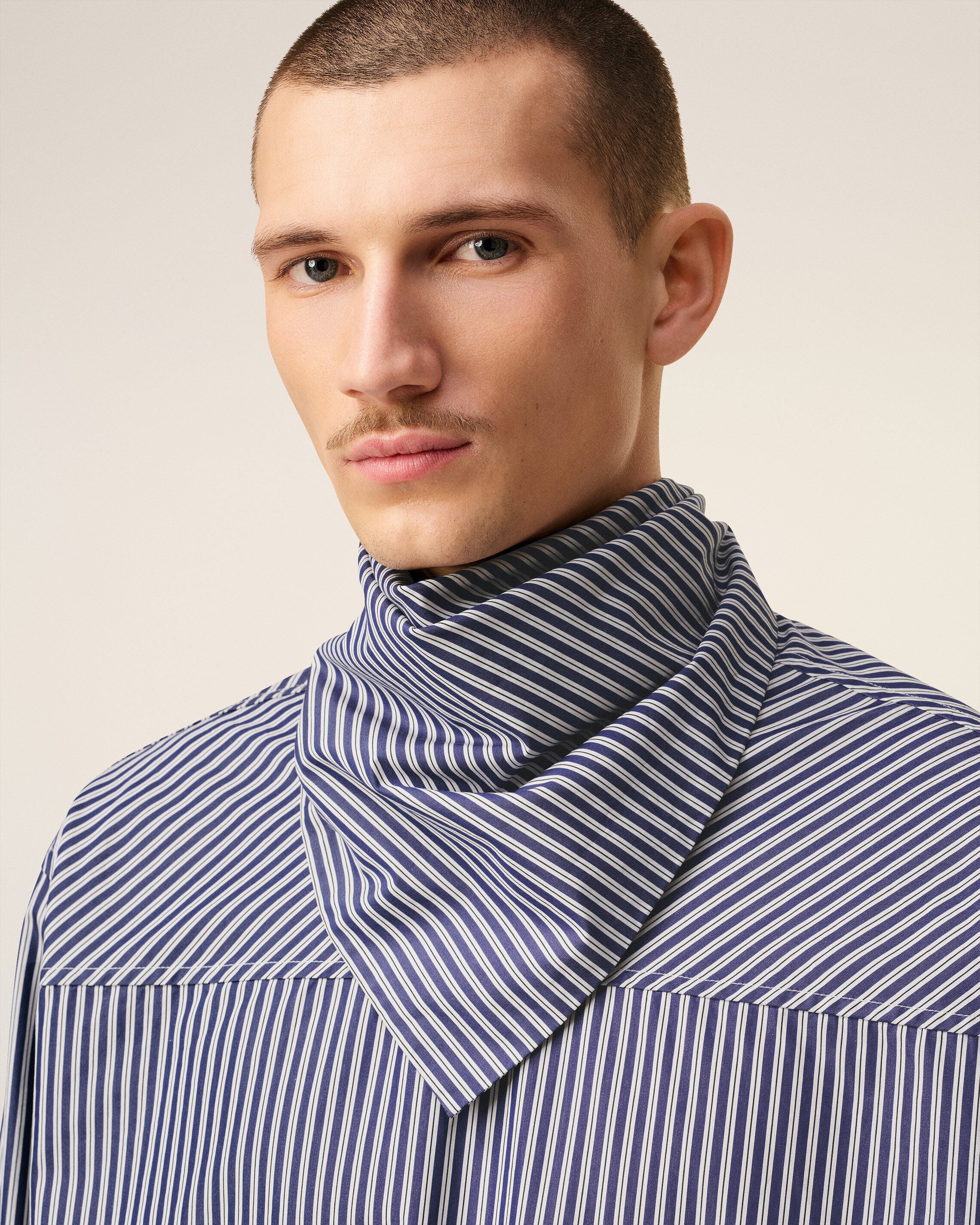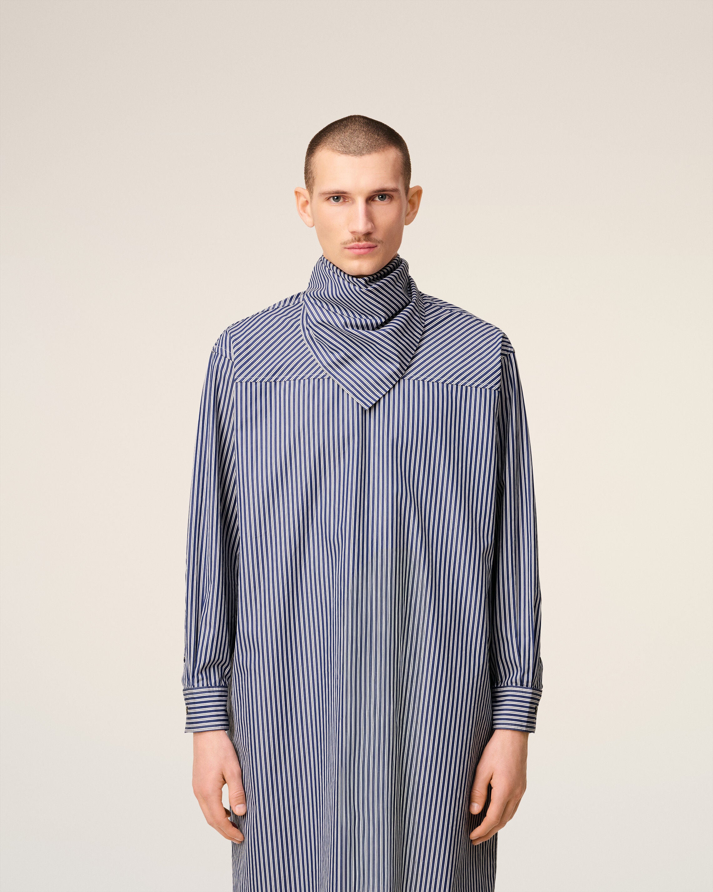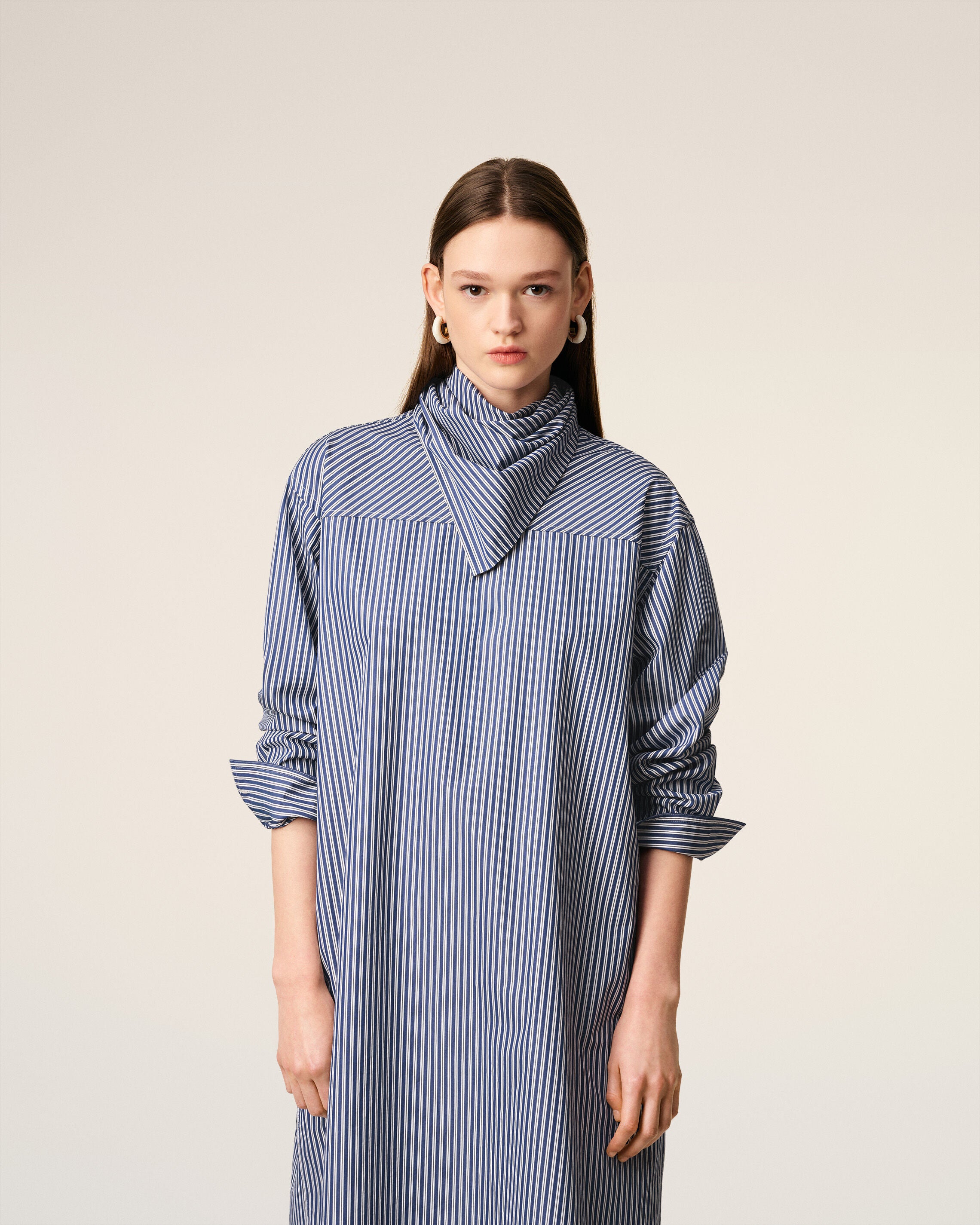 Midi dress in striped cotton poplin with sewn on bandana collar.
