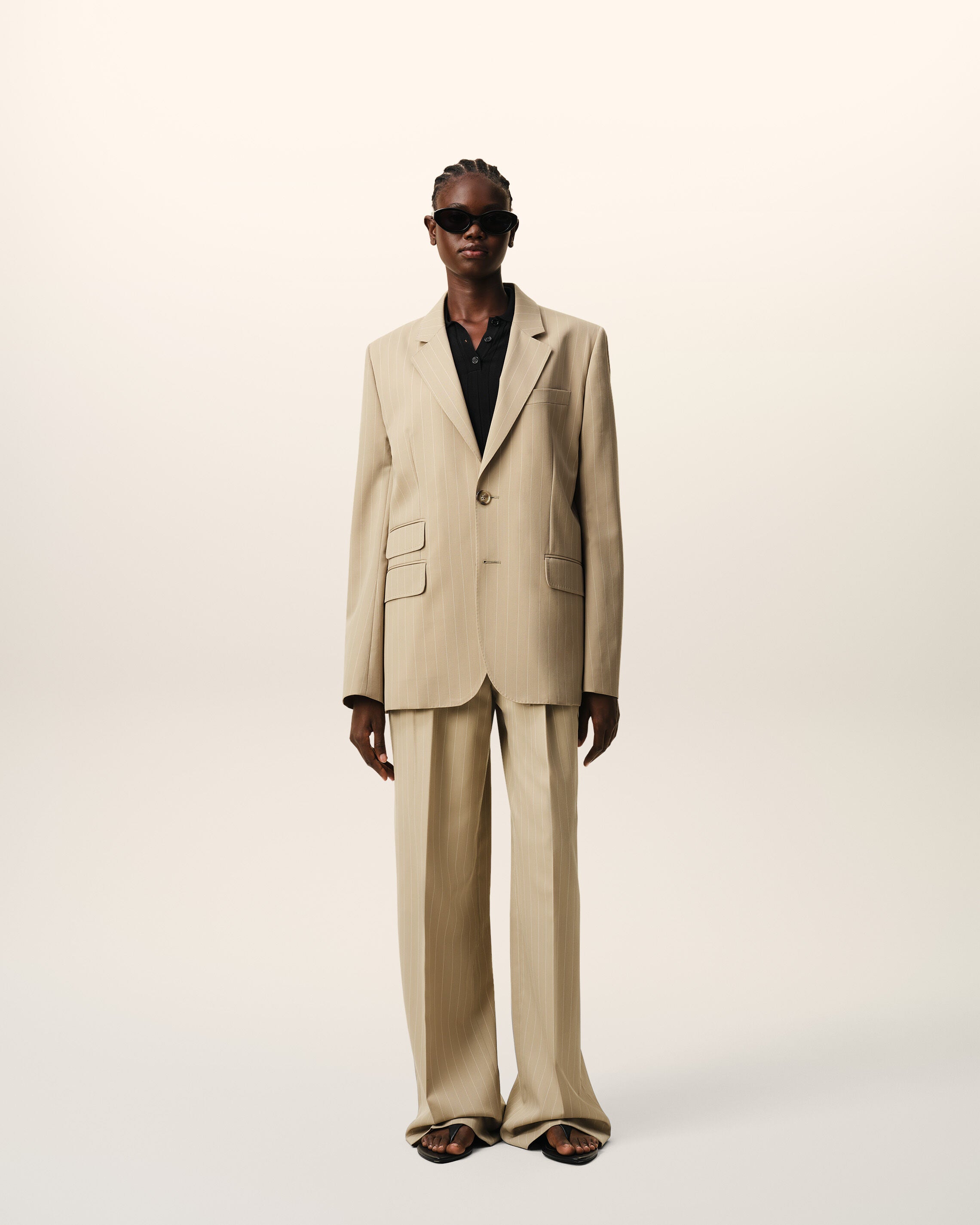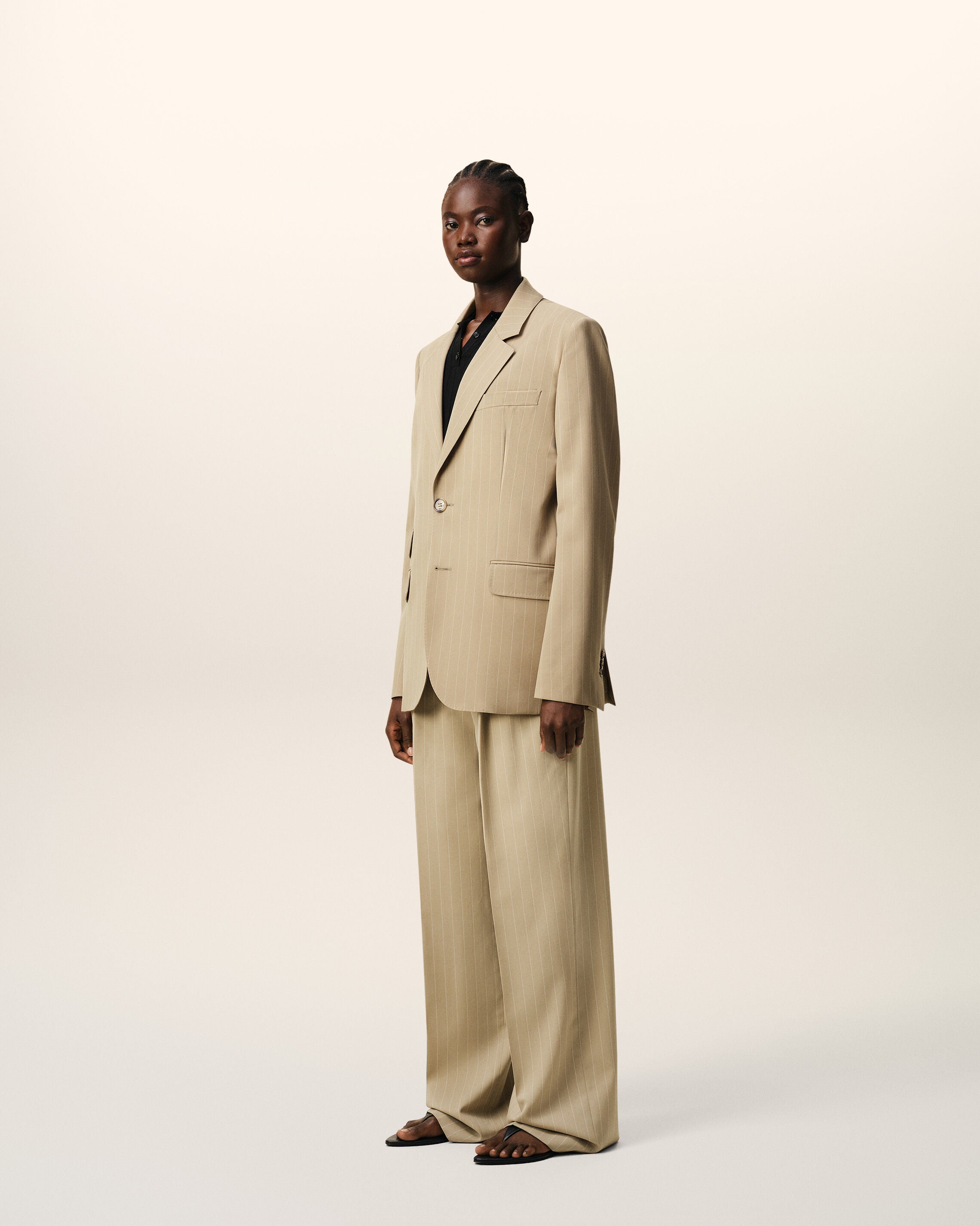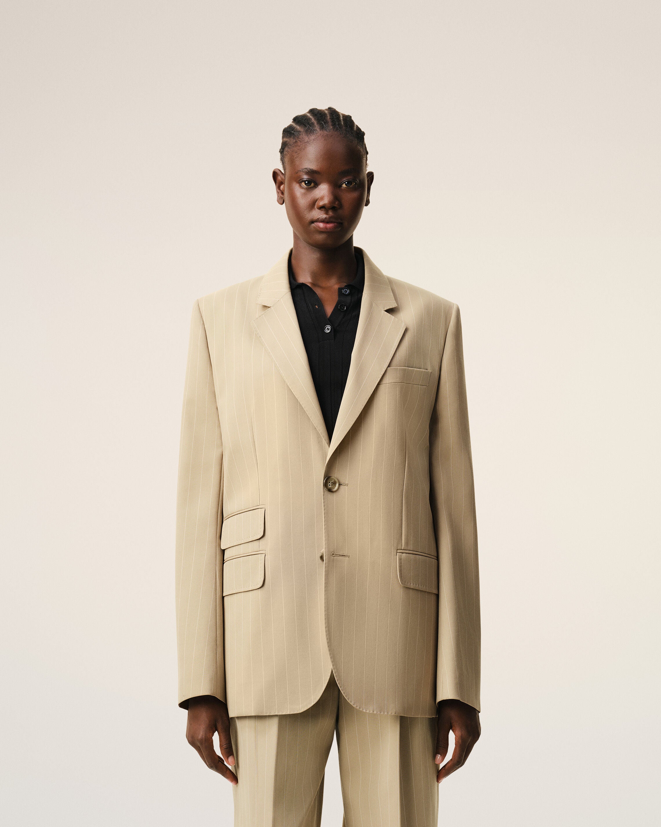 Single breasted jacket in striped wool gabardine.