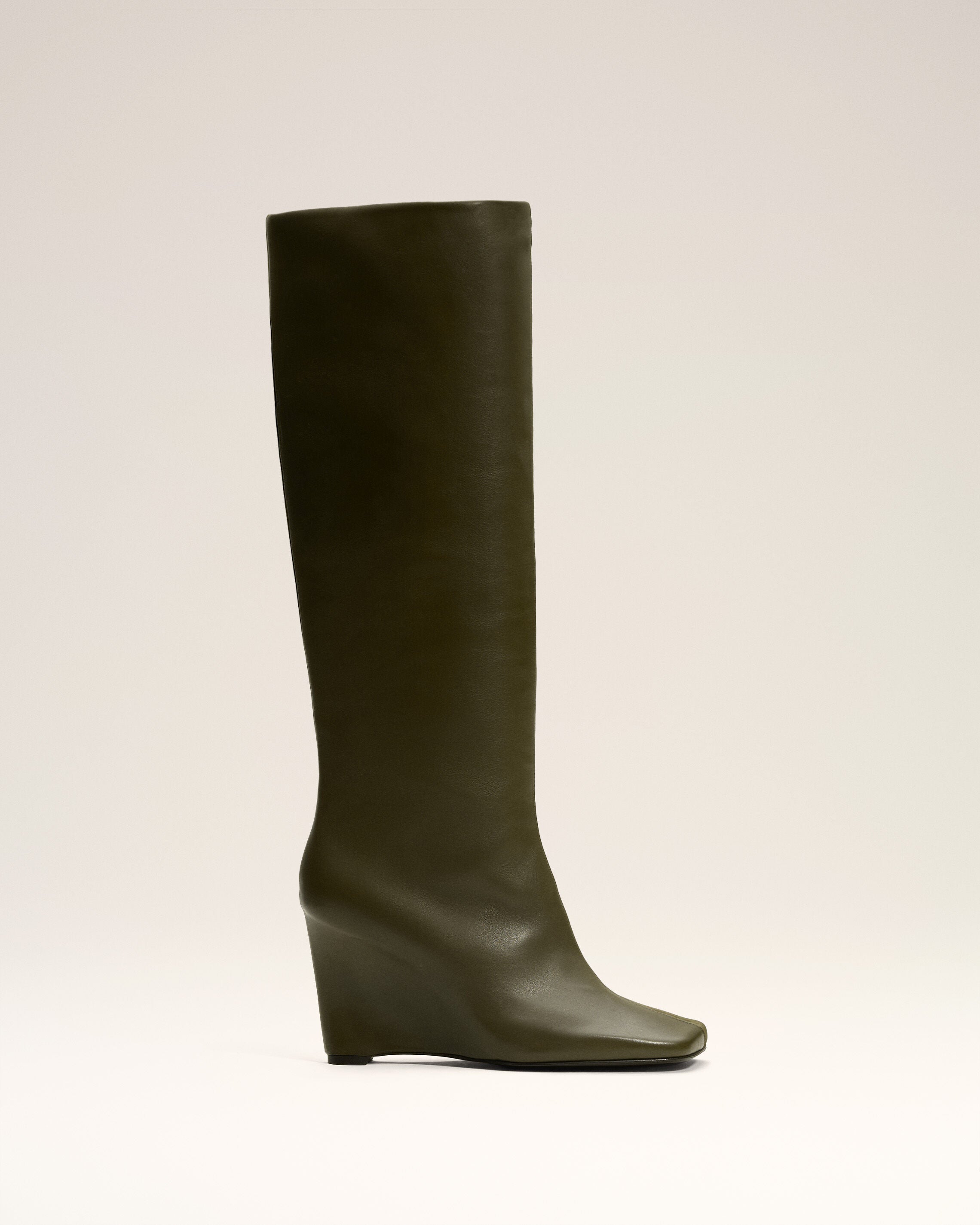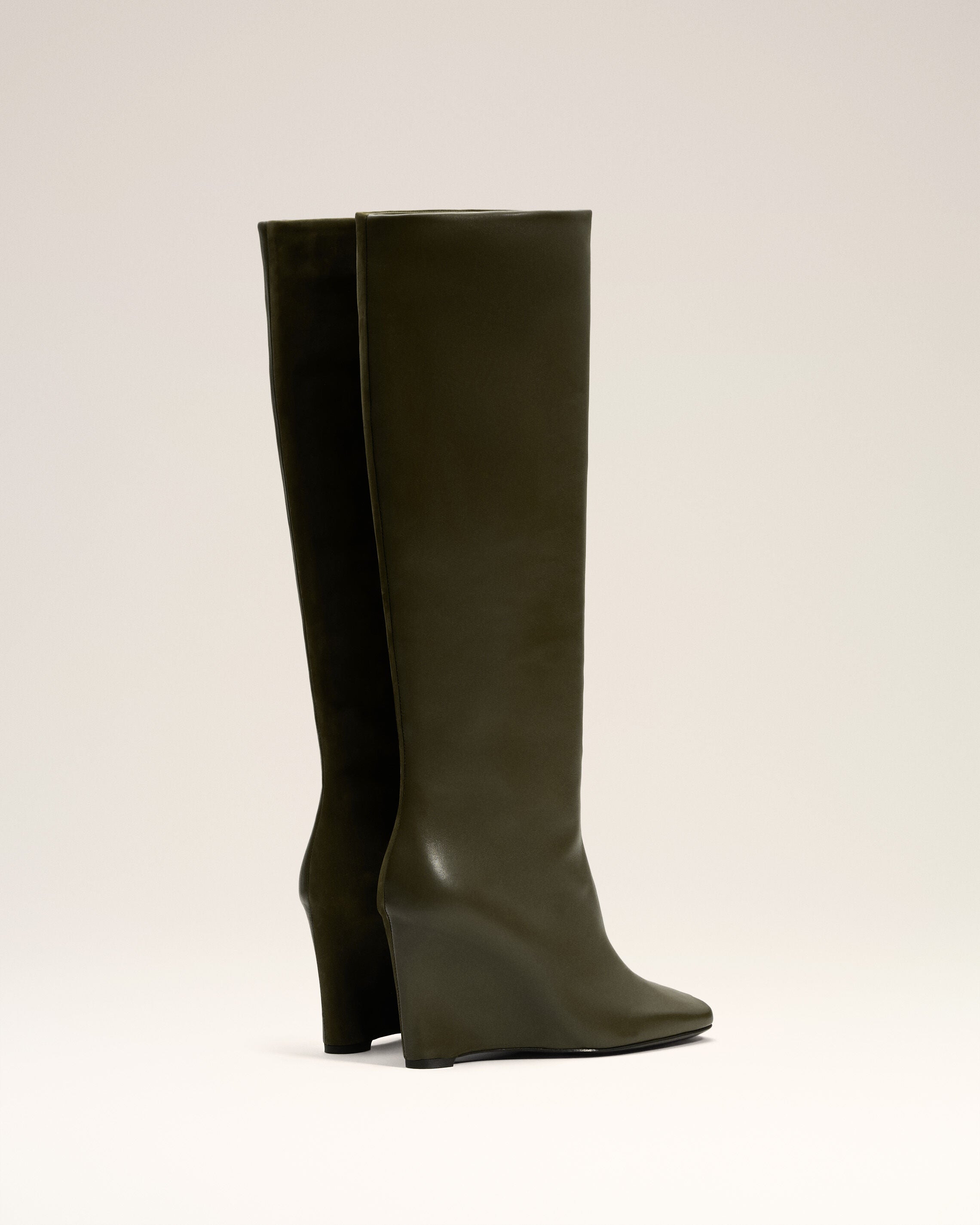 Botas hasta la rodilla de cuña bicolores de piel satinada lisa y nobuk.