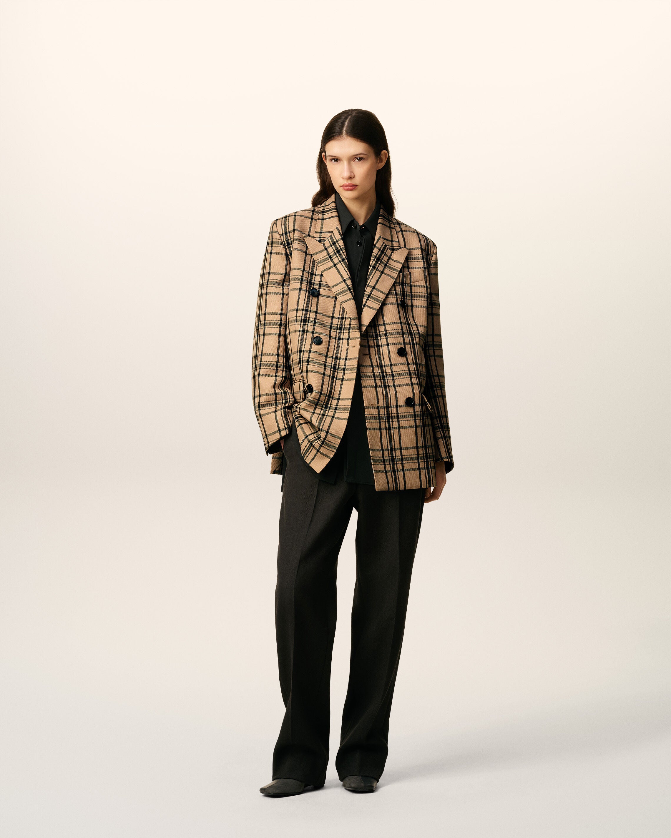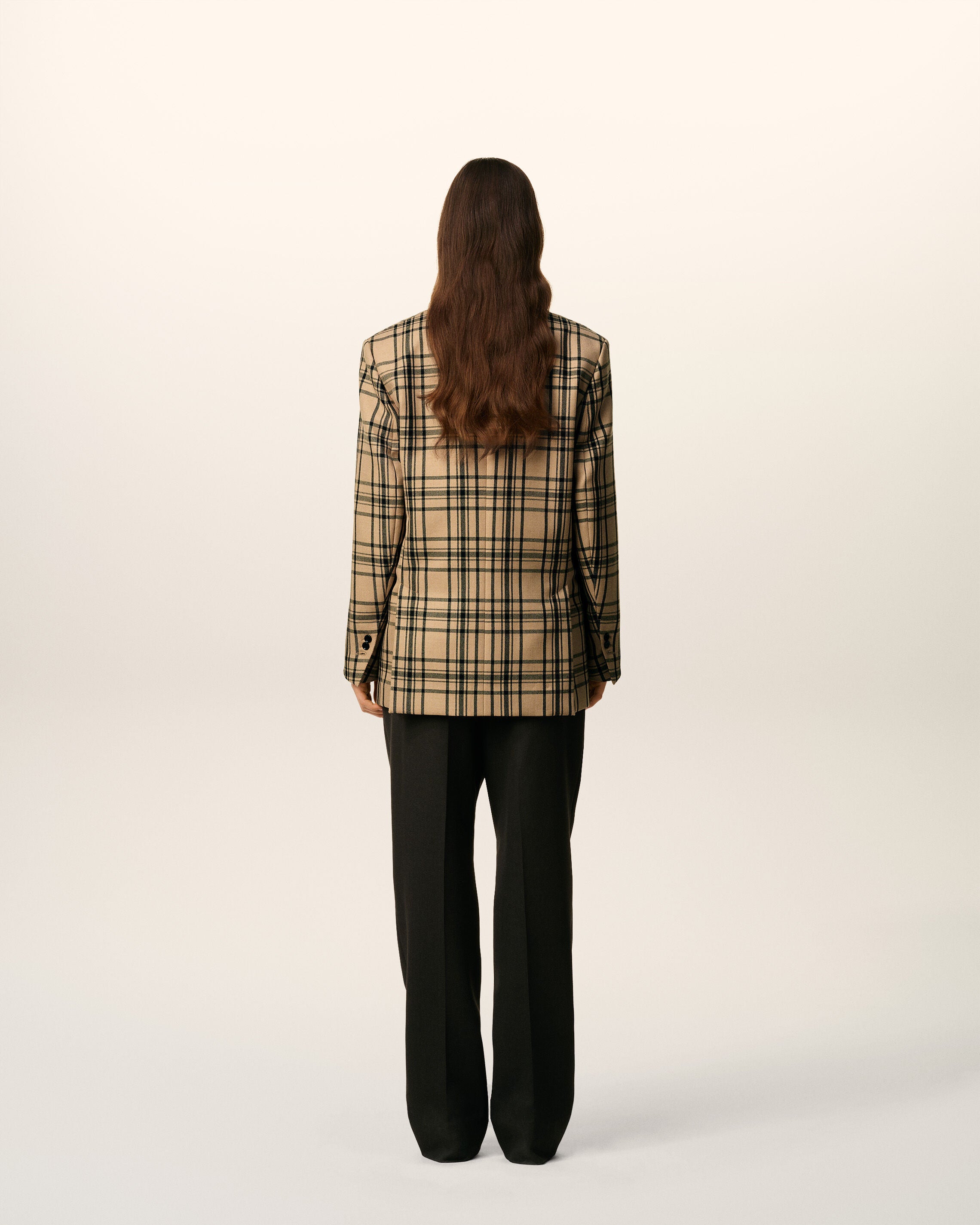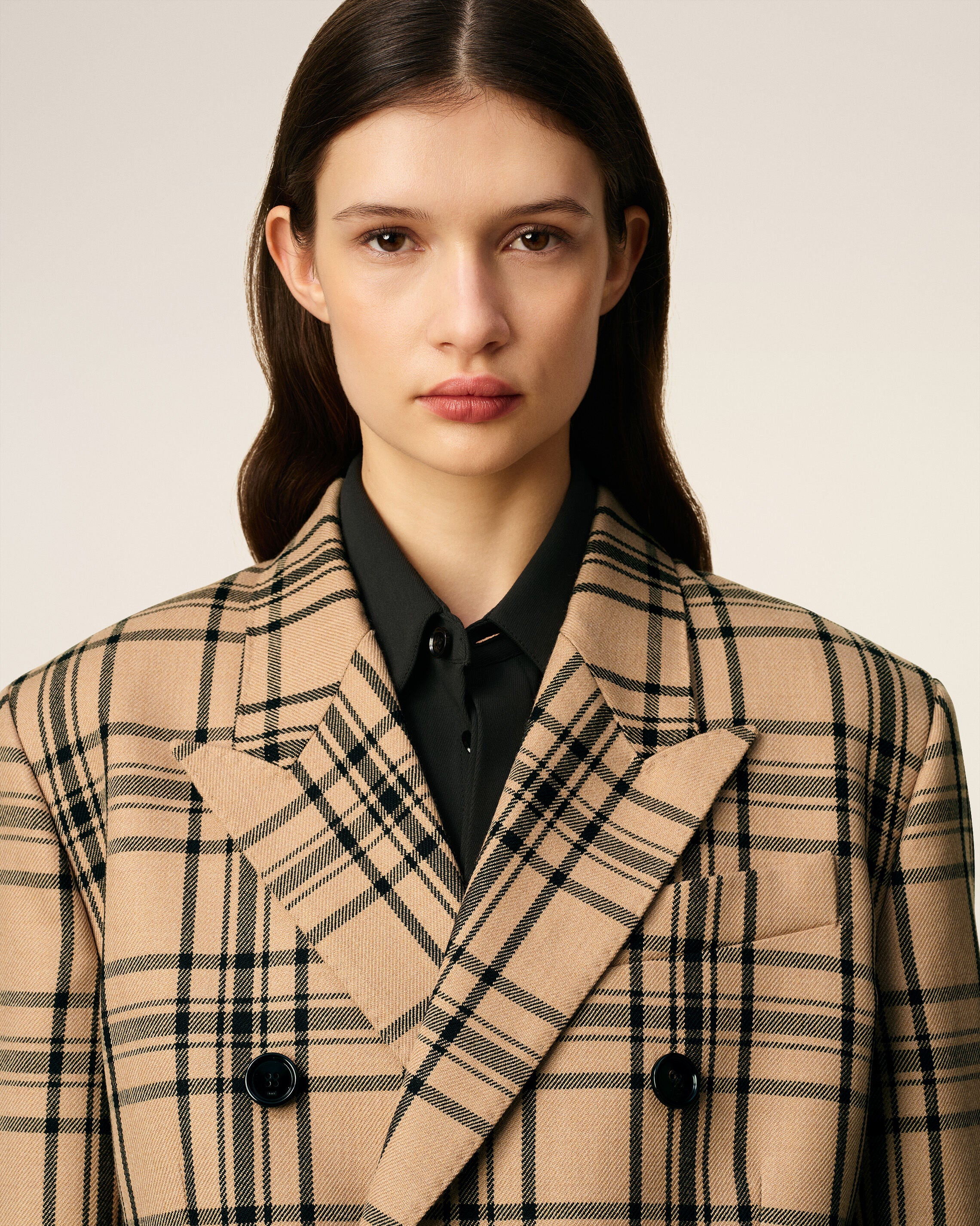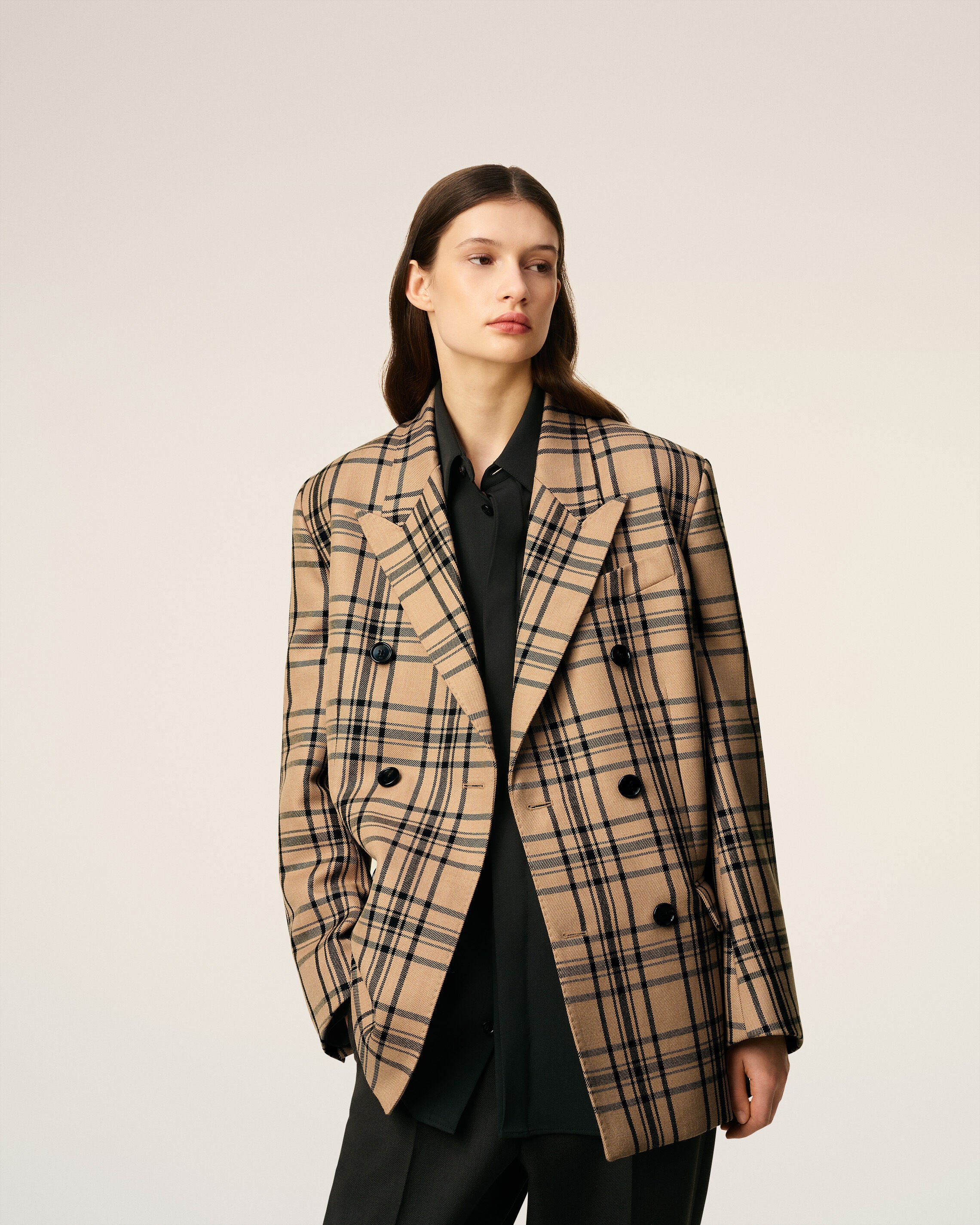 Chaqueta holgada cruzada de lana marrón de cuadros