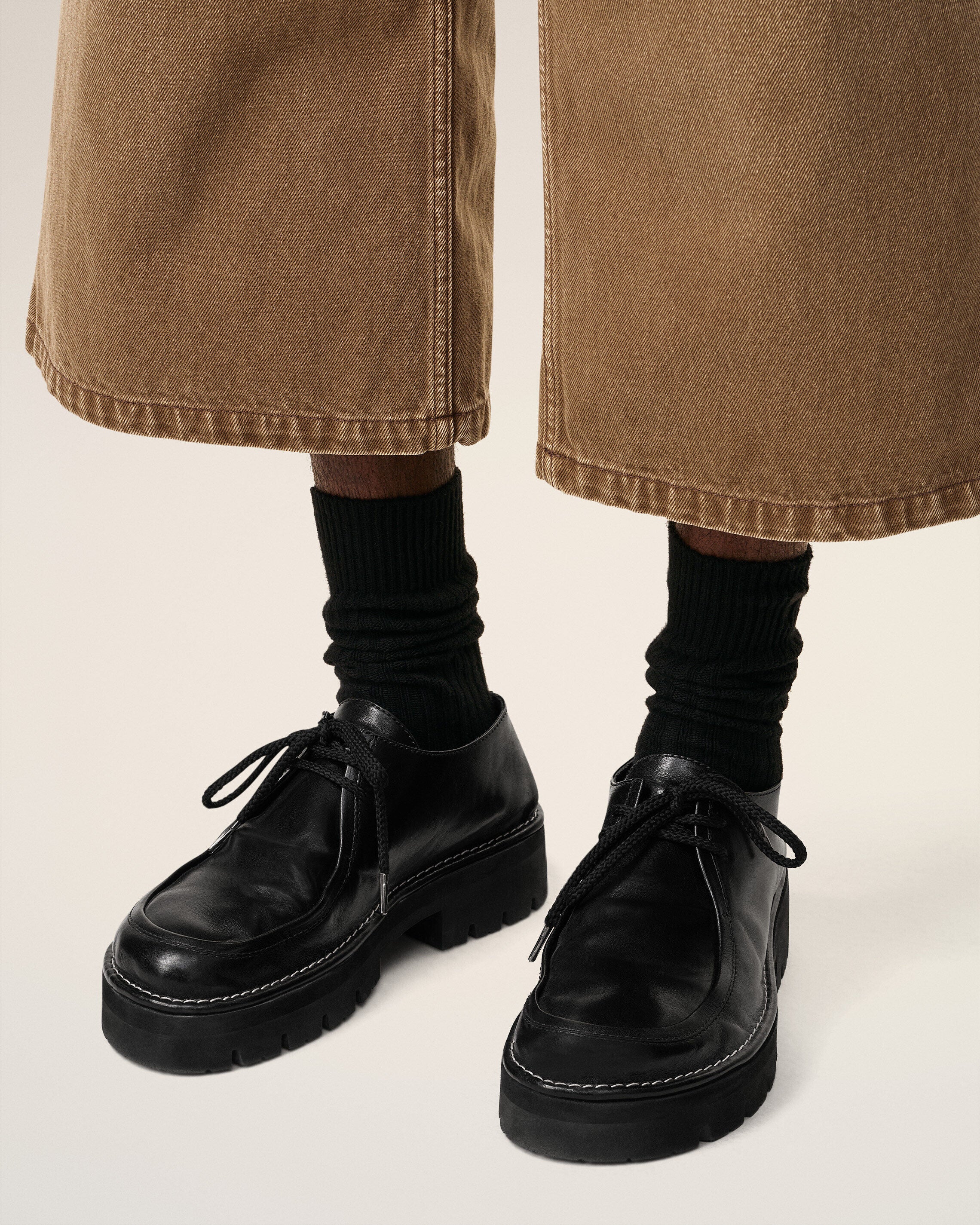 Derbies à lacets à bout anatomique en cuir lisse brillant.