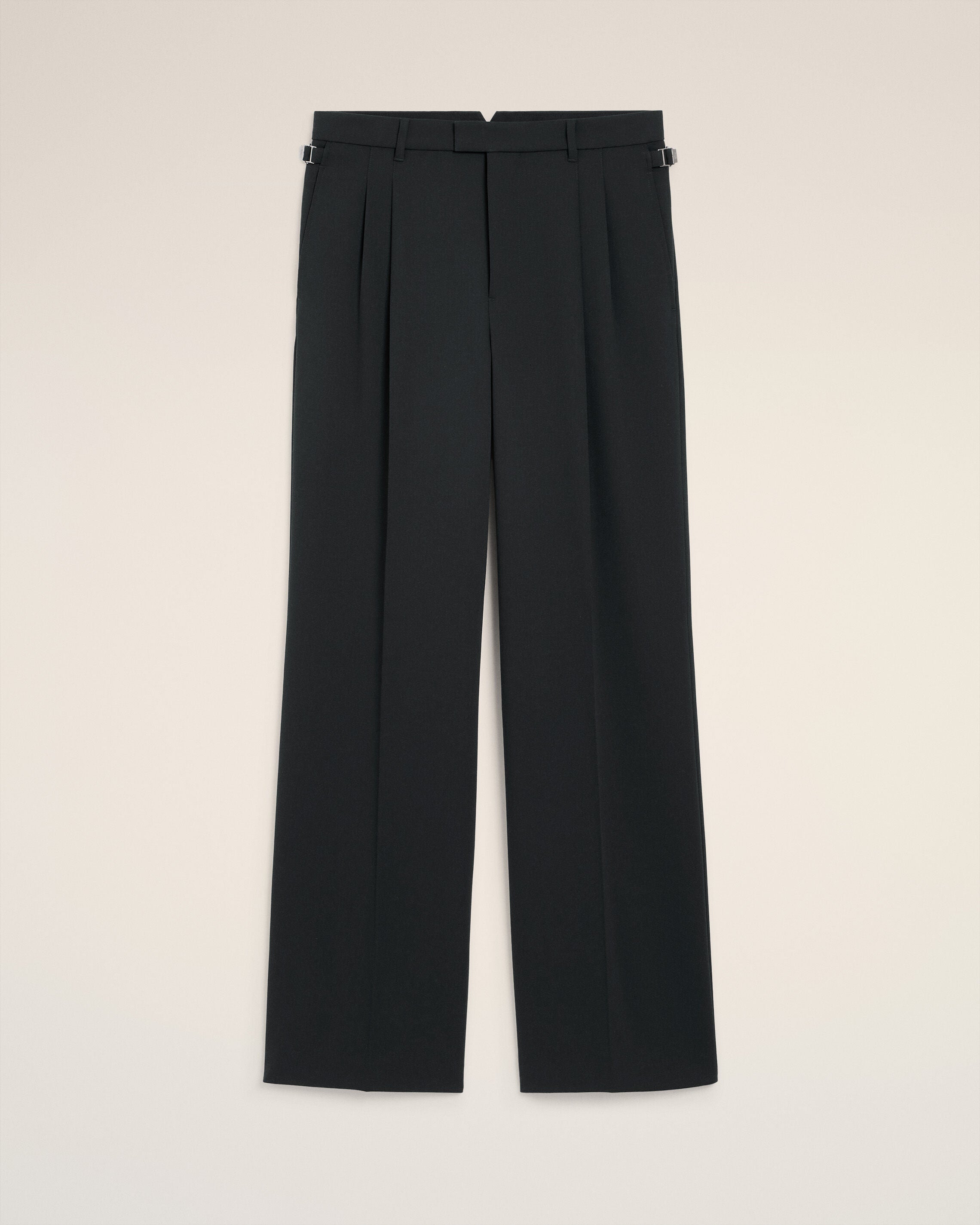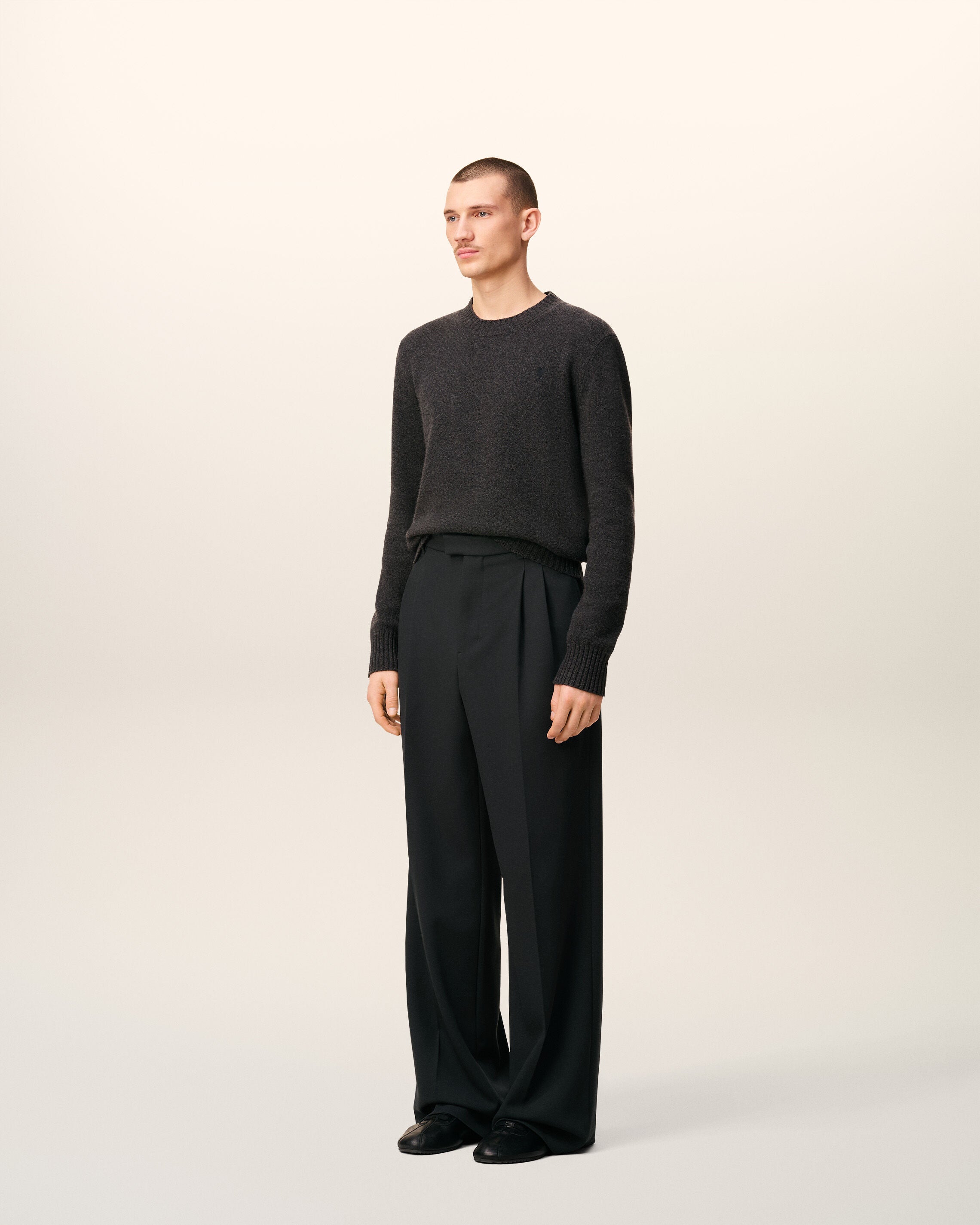 Pantaloni taglio ampio a vita bassa con due pinces in tricotin di lana.