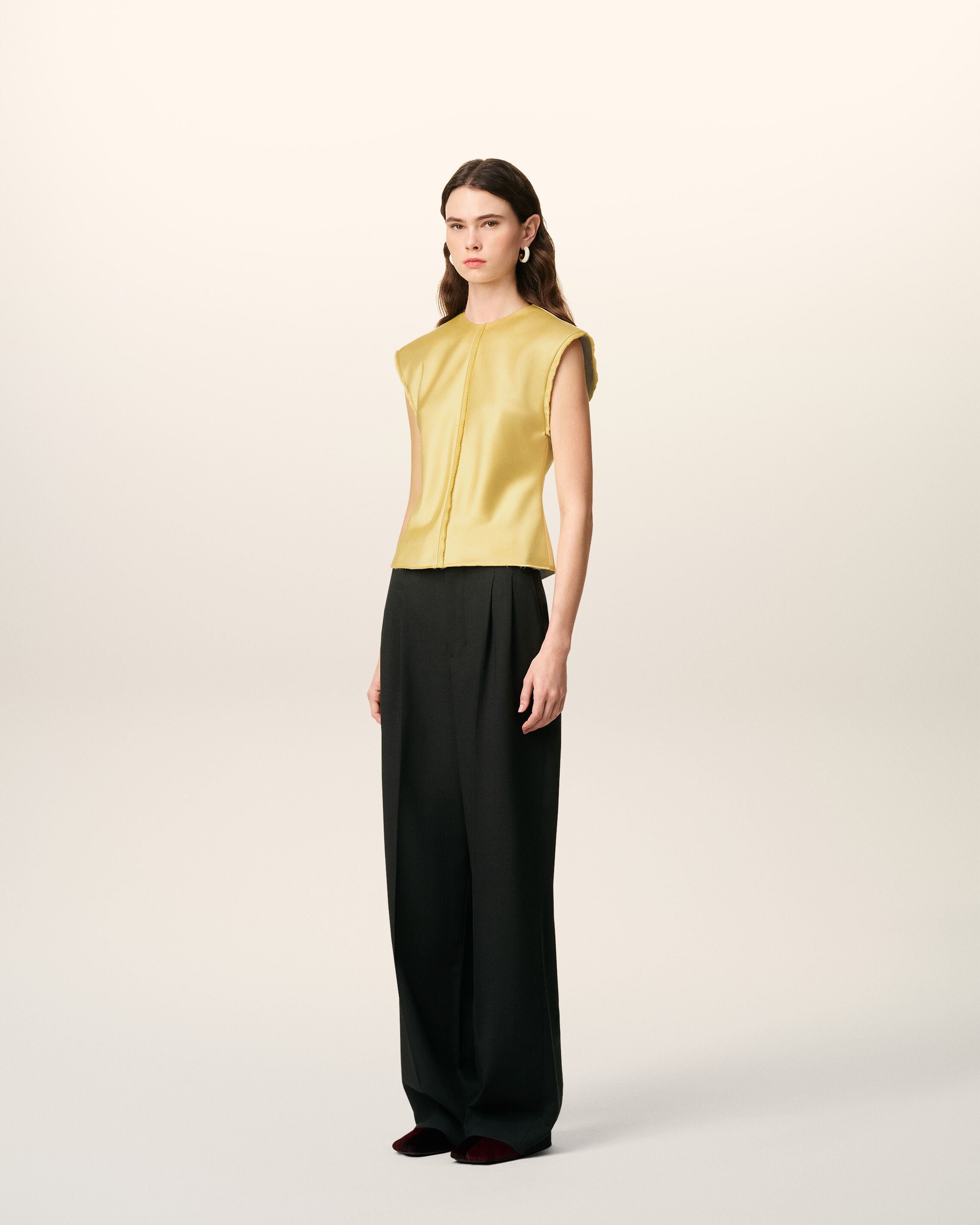 Top sans manches avec détails bords francs en satin.